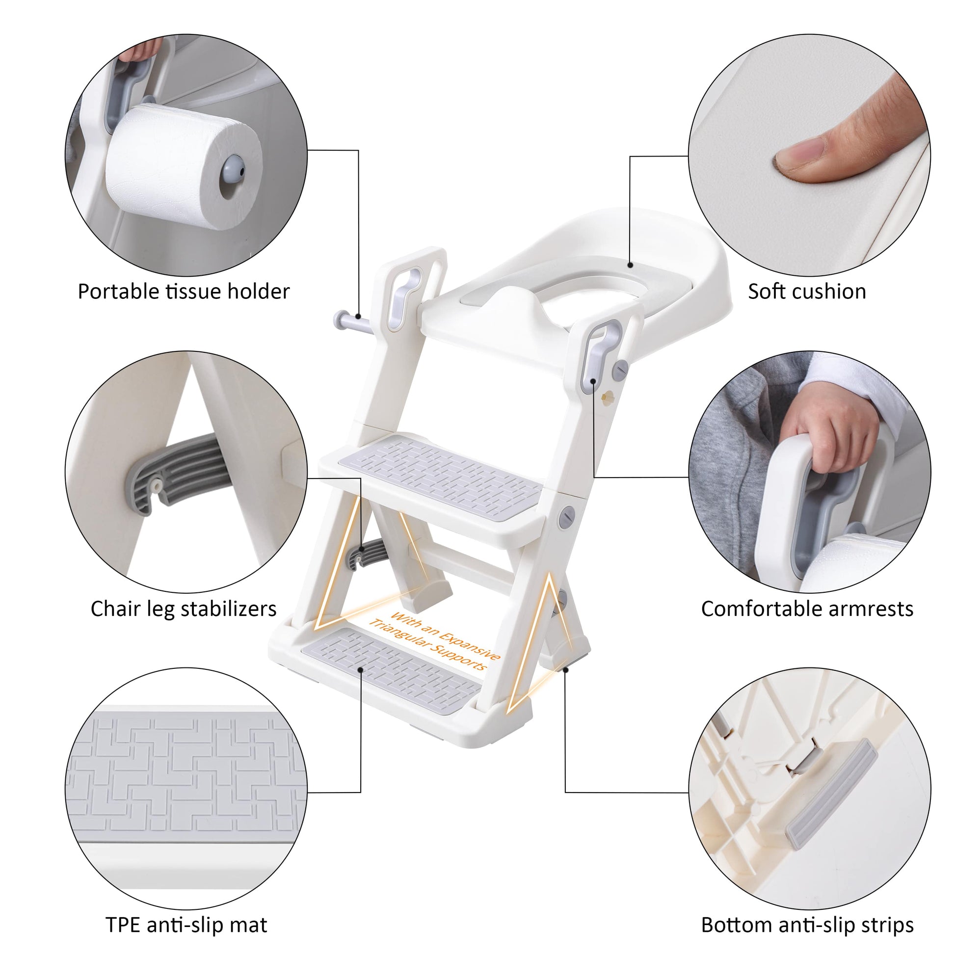 Enhanced Design and Quality Materials: Our upgraded potty training seat addresses previous design flaws with a durable, soft cushion, wider steps, comfortable handles, an optimized splash guard, and an anti-slip design. Made from premium plastic, this seat supports up to 120 lbs, offering robust and reliable use.